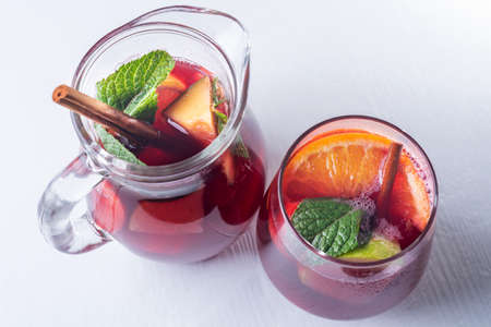 Jug and glass with sangria, with fruits, mint and cinnamon.