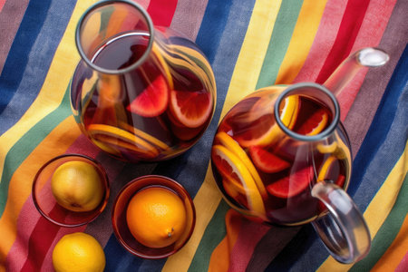 top view of a colorful sangria pitcher and wine glasses, created with generative ai