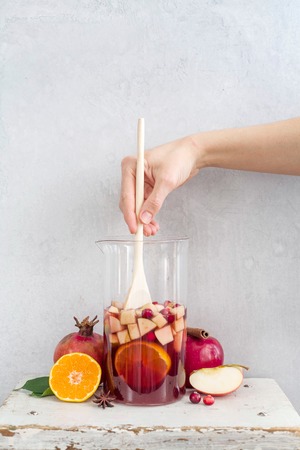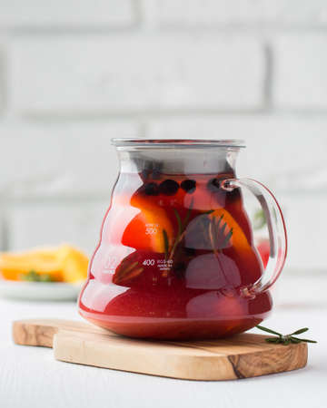 Fruit sangria in a jug and glasses on a wooden table in Tuscany, Italy