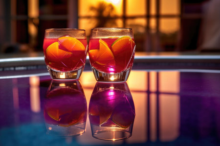 pool reflection of tequila sunrise cocktails, created with generative ai