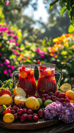 A glass pitcher of fruit punch with lemon slices, berries, and mint sits on a wooden table, surrounded by fresh fruits and flowers in a sunny outdoor setting.