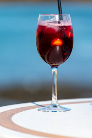Cold sangria with red wine on sunny terrace in hotel, bar or restaurant with tropical landscape