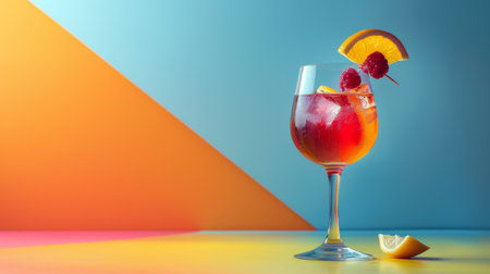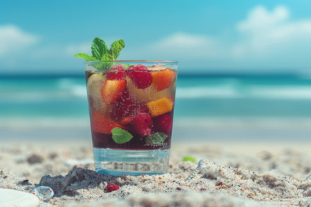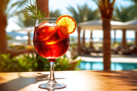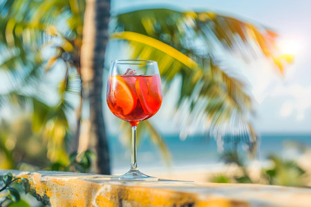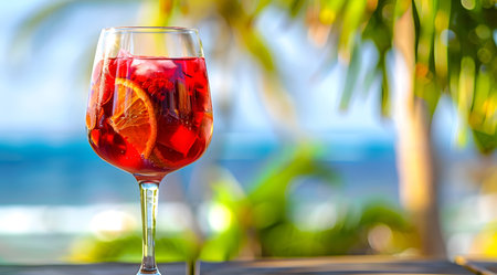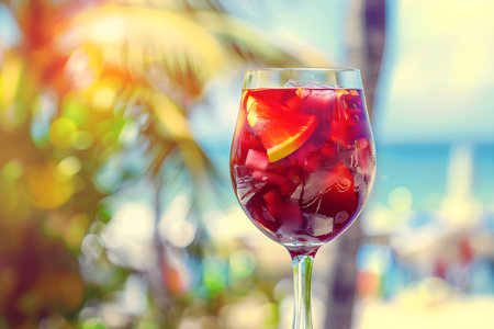 sangria glass with fruit garnish and beach umbrella shadow, created with generative ai