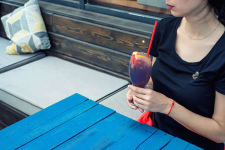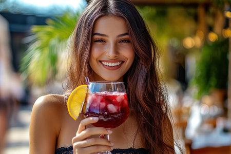 Vertical photo of a woman enjoying a tropical cocktail in an outdoor terrace