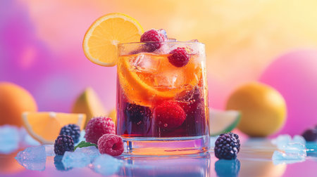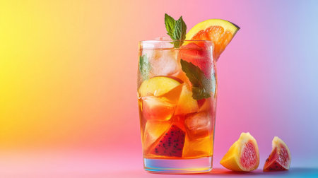 Refreshing red fruit juice with citrus slices in sunlight with floral shadows. That the image is generated using AI.