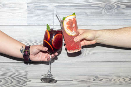 Refreshing summer cocktails with a slice of orange and grapefruit. Alcoholic drink. Garnished with a sprig of mint and ice cubes. In the bar. Foreground.