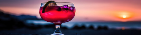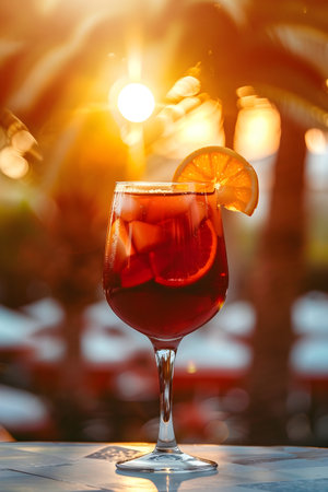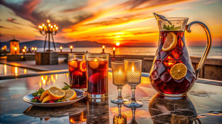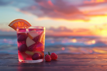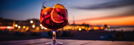 a refreshing glass of sangria with a beach sunset in the distance, created with generative ai