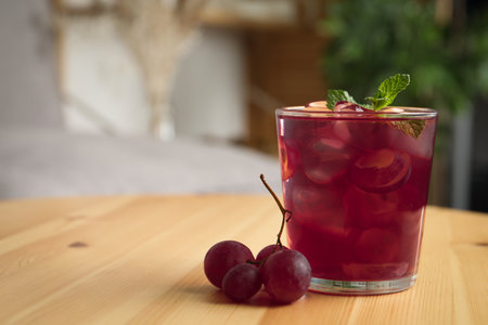 Refreshing drink with soda water, grapes, ice and mint on wooden table indoors. Space for text