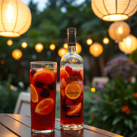 A pitcher and glass filled with a vibrant red sangria, brimming with fresh orange slices, berries, and other fruits, set on a rustic wooden table outdoors.