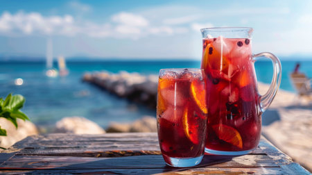 Refreshing Sangria: A Fruity Spanish Punch Served on Rustic Wooden Table with a Scenic Beach, Palm Trees, and Sea View in the Blurred Background - Perfect for Summer Getaways - Generative AI