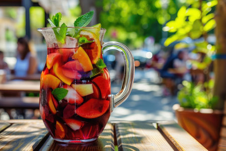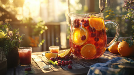 Refreshing fruit punch combines summer fruits in a colorful pitcher, perfect for sunny gatherings.