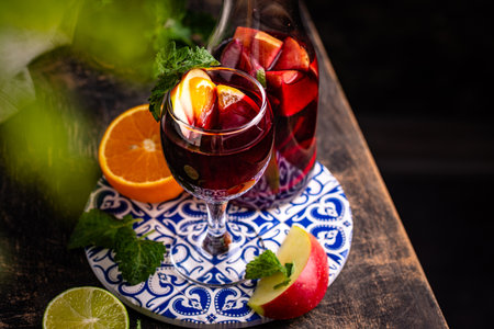 Homemade red wine sangria with fruits in glasses and pitcher and fresh fruits near. View with copy space.