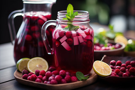 Glass pitcher full of refreshing summer drink with raspberry, lemon, orange and mint