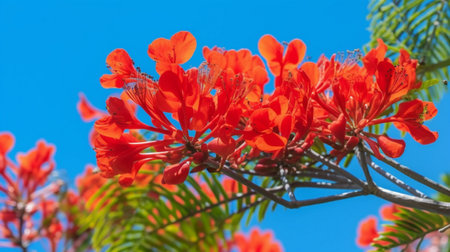 Vibrant red Flamboyant flowers bloom against soft blue sky backdrop.