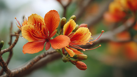 Vibrant orange and yellow Flamboyant flower blooms gracefully in the sunshine.