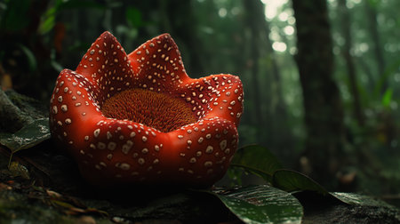 Vibrant tropical flower with a striking red and white pattern found in a lush rainforest setting during the evening hours