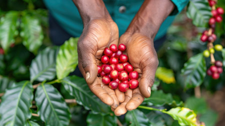 A pair of hands holding vibrant red coffee cherries, freshly picked from lush green coffee plants, showcasing the essence of agricultural life and the beauty of nature.