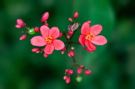 Pergrina (Jatropha integerrima). A colourful flowering shrub blooming here in the landscaping of the Abu Dhabi Corniche, UAE