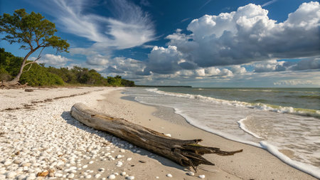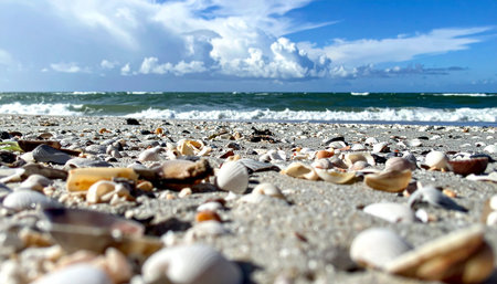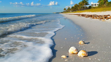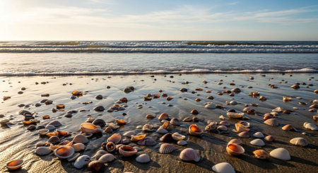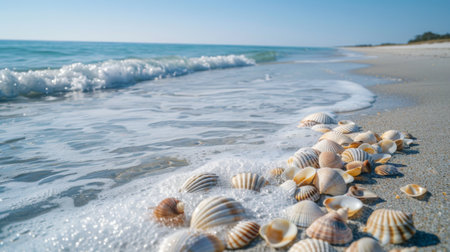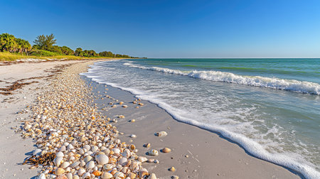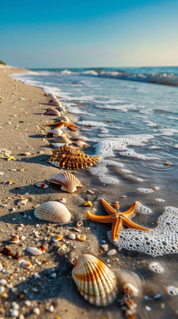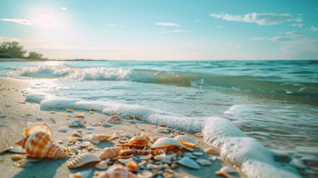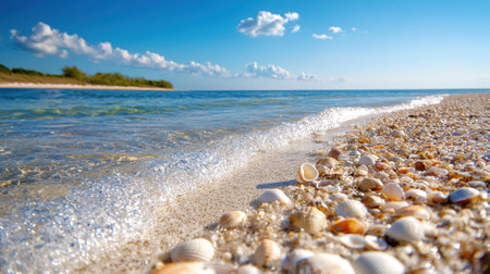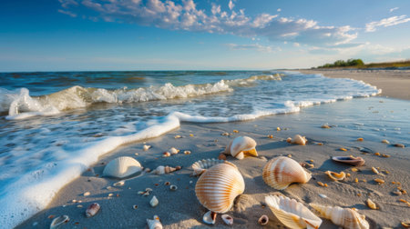 This picturesque beach scene showcases a sandy shoreline dotted with beautiful seashells, framed by gentle waves and a clear blue sky.
