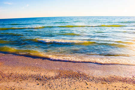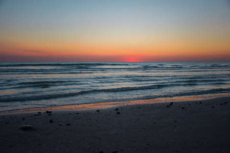 Beautiful sunset over the sea. Sandy shores and calm sea during sunset.
