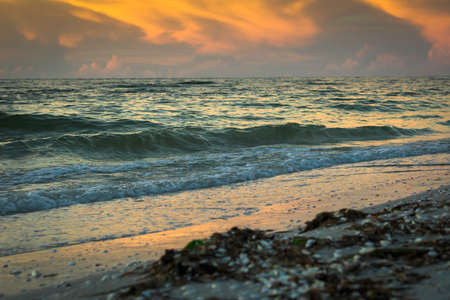 Beautiful sunset on the beach with white sand and sea shells.