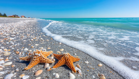 Two starfish rest on a sandy shore as gentle waves roll in. The image showcases a bright blue sky merging with turquoise waters. The scene is illuminated by natural sunlight, presenting a vibrant composition. Suitable for travel, nature, or coastal themes, it lends itself to various commercial applications.