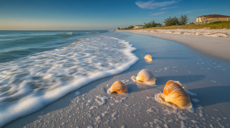 A tranquil beach at sunrise, with soft waves washing ashore and an array of seashells resting on the golden sand. The sky is painted in warm hues as the day begins.