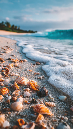 A picturesque beach scene featuring seashells scattered on the shore with gentle ocean waves rolling in. The vivid tropical tones create a peaceful and natural atmosphere.