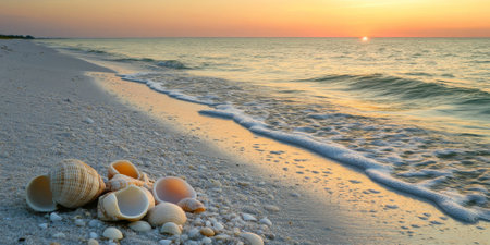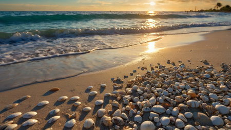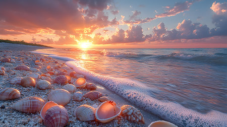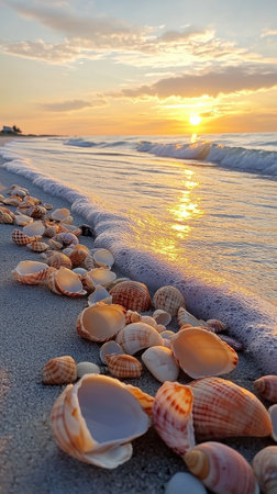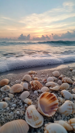 Peaceful beach scene features an array of seashells scattered on soft sand as gentle waves roll in during a stunning sunset, creating a serene coastal atmosphere.