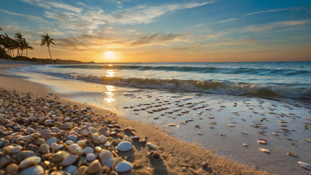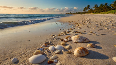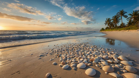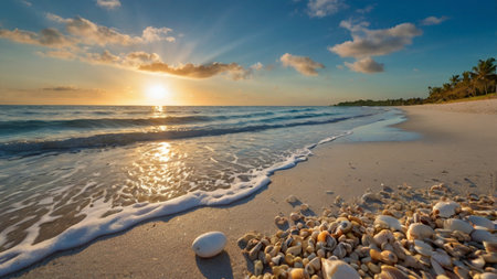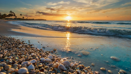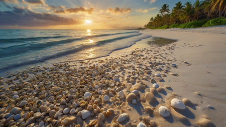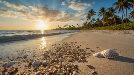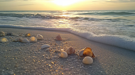 At sunrise, the soft ocean waves gently lap at the shore, revealing a collection of seashells on the sandy beach. The warm hues of the sky reflect off the water, creating a serene atmosphere.