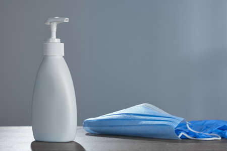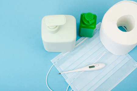 Coronavirus prevention medical masks, sanitizer gel, liquid soap for hand hygiene corona virus protection. Studio Photo