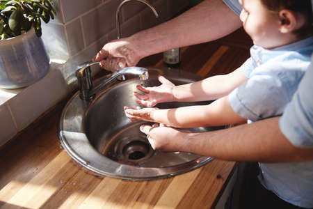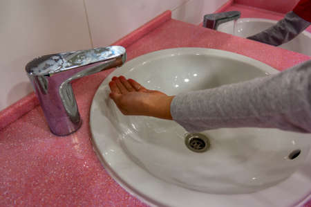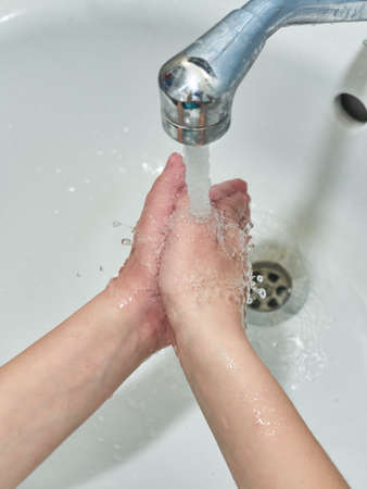 Close-up, a child washes his hands in the bathroom, the concept of personal hygiene and prevention.