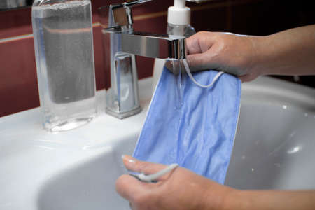 Washing a medical mask in the sink. Cotton reusable medical mask for protection from Covid-19.