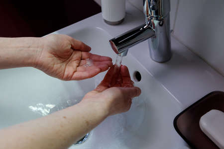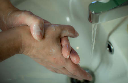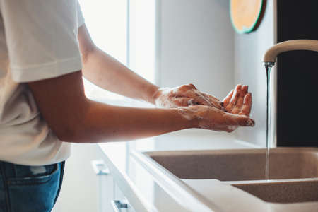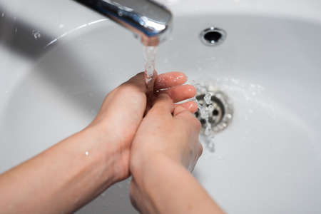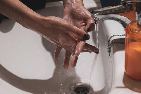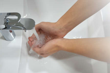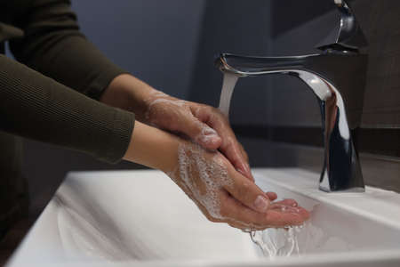 Woman wash hands with soap in the sink with water.