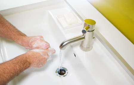 Man washing his Hands to prevent virus infection and clean dirty hands with soap and water
