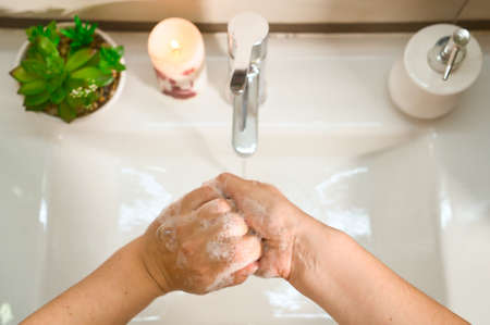 Washing hands with soap and hot water at home bathroom sink women cleansing hand hygiene for coronavirus outbreak prevention. Corona Virus pandemic protection by washing hands frequently.