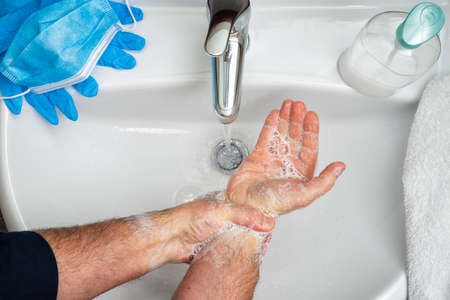 Upper view photo of a caucasian man washing his hands with soap during the epidemic situation