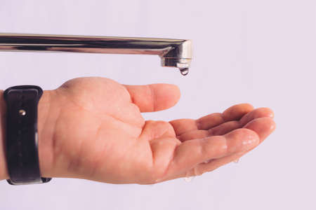 Tap water drop and palm. Symbol of water shortage or cutoff of water supply. Selective focus. Background with copy space for text, toned