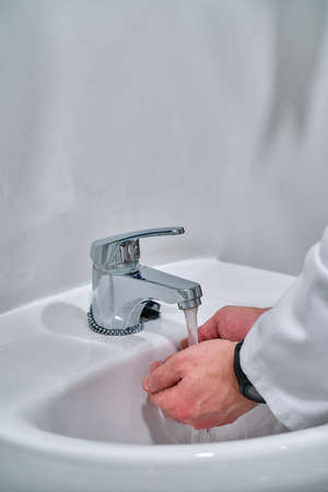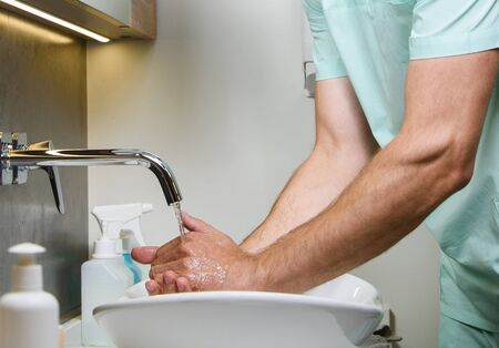 Close-up doctor, therapeutic or medical advisor washing his hands before surgery at medical office, idoors . Concept of healthcare, care, medicine and professional occupation