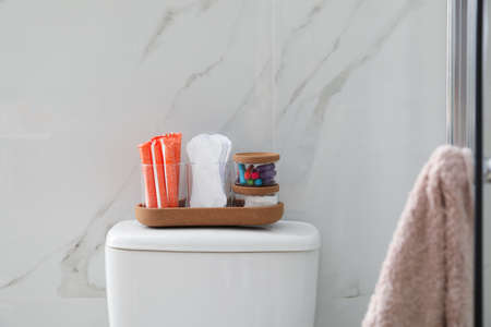 Organizer with different feminine hygiene products on toilet bowl in bathroom