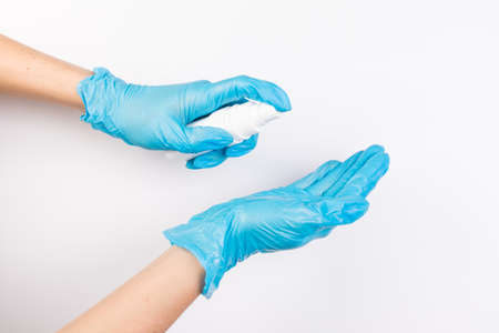 Hand in medical gloves applying sanitizer gel onto other people hands for protection on white background.