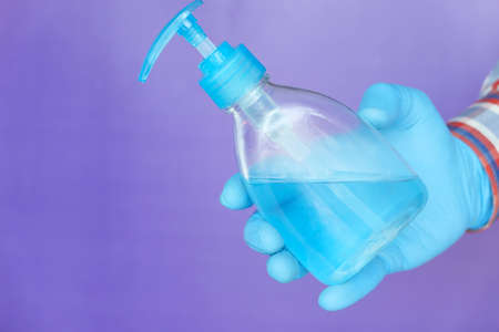 man hand in medical gloves holding sanitizer gel for preventing virus