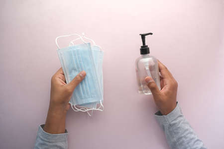 man hand holding surgical face mask and sanitizer gel