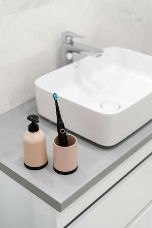 Oral care and dental hygiene concept. Electric toothbrush in cup and soap dispenser bottle near basin. Element of white modern bathroom with chrome water tap over sink at blurred copy space background