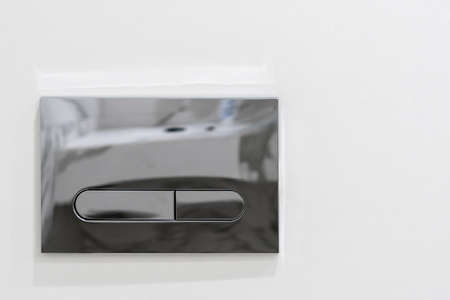 Close up view of economic toilet flush press with two chrome separate buttons. Built in mechanism of new concealed cistern. Modern bathroom elements on white copy space background