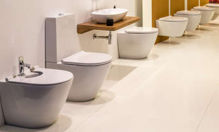 samples of modern sanitary ware for the toilet. new modern toilet in the plumbing store.