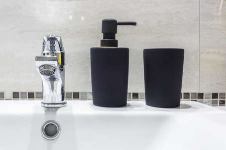 Ceramic Water tap sink with faucet with black soap and shampoo dispensers in expensive bathroom