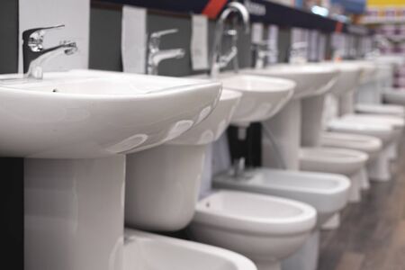 New white sink and toilet bowl in a store abstract background.