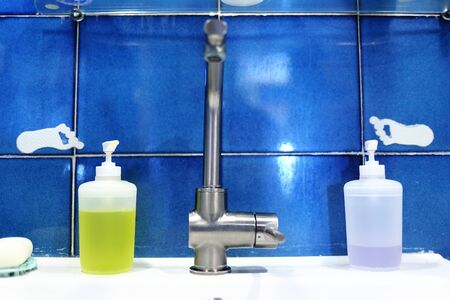 Sink with liquid soap and disinfectant spray in bottles stock photo