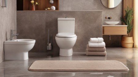This modern bathroom showcases elegant design elements with minimalist fixtures and stylish accessories, creating a serene and welcoming atmosphere for relaxation and hygiene.